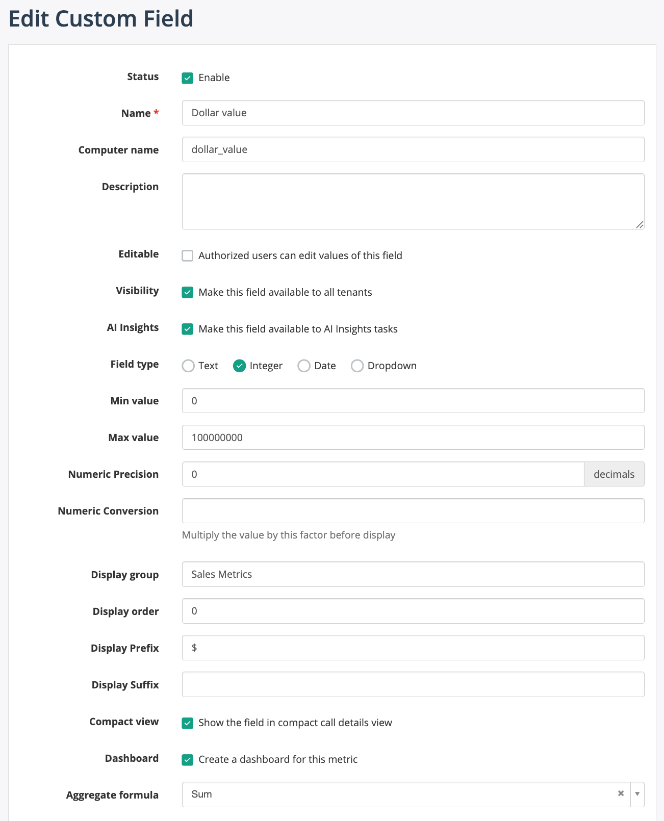 Figure: Custom Field configuration showing AI Insights checkbox and Dashboard option.