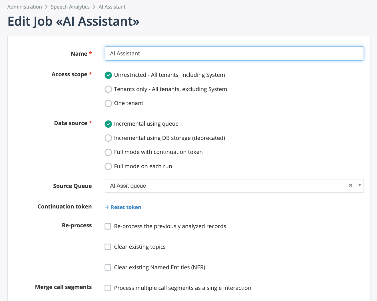 Menu path: Administration > Speech Analytics > AI Assistant > Jobs