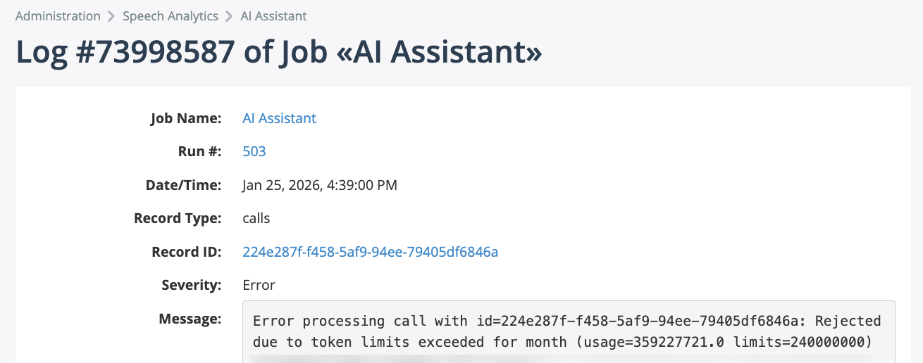 Administration > Speech Analytics > AI Assistant > Jobs → Select job → Logs tab