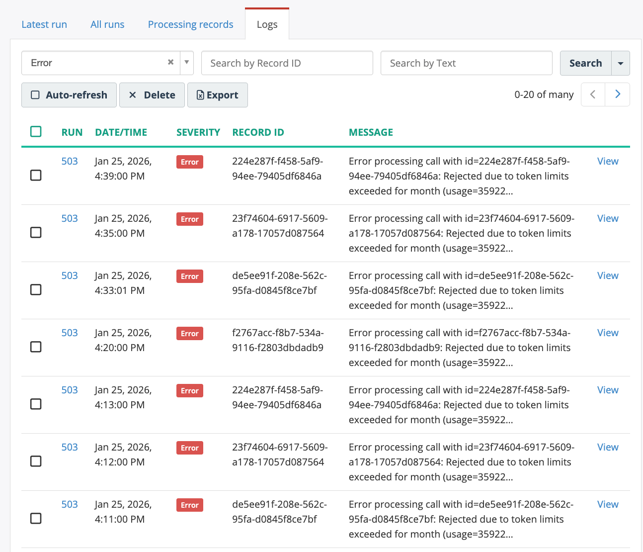 View per-conversation processing status from the Processing records tab on the job view. This shows which conversations were processed and their execution status.