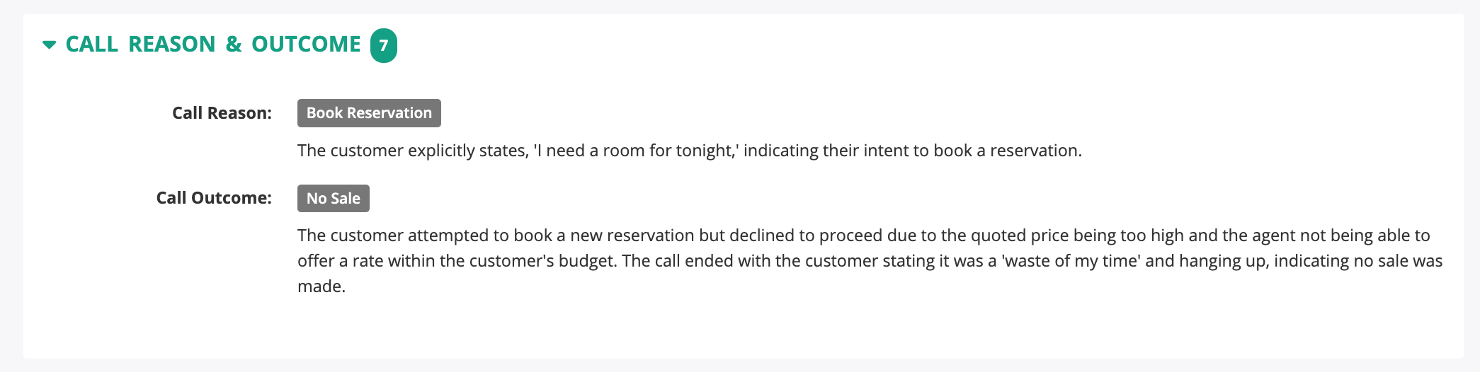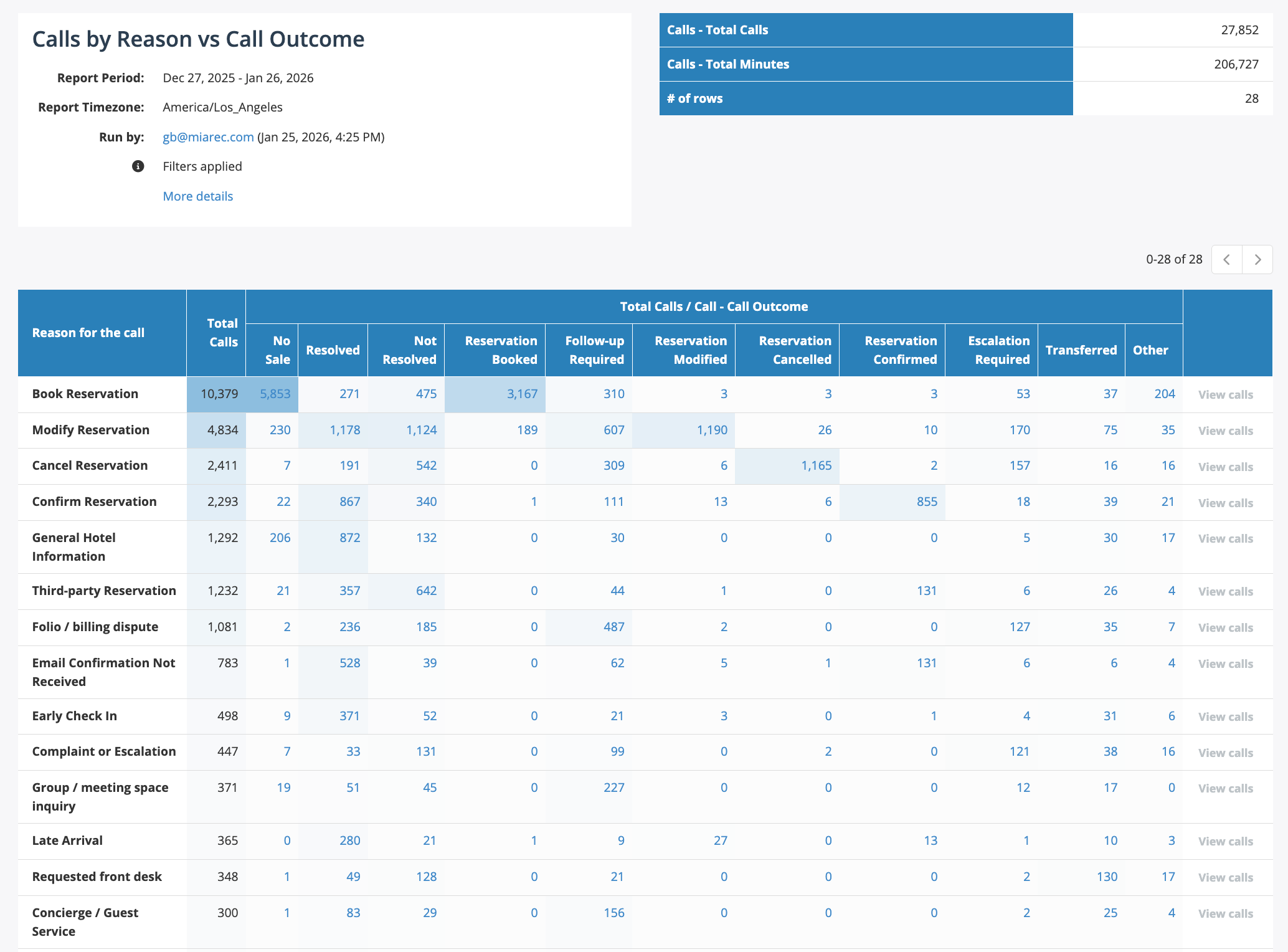 Figure: Example report showing Call Reason breakdown by Outcome.