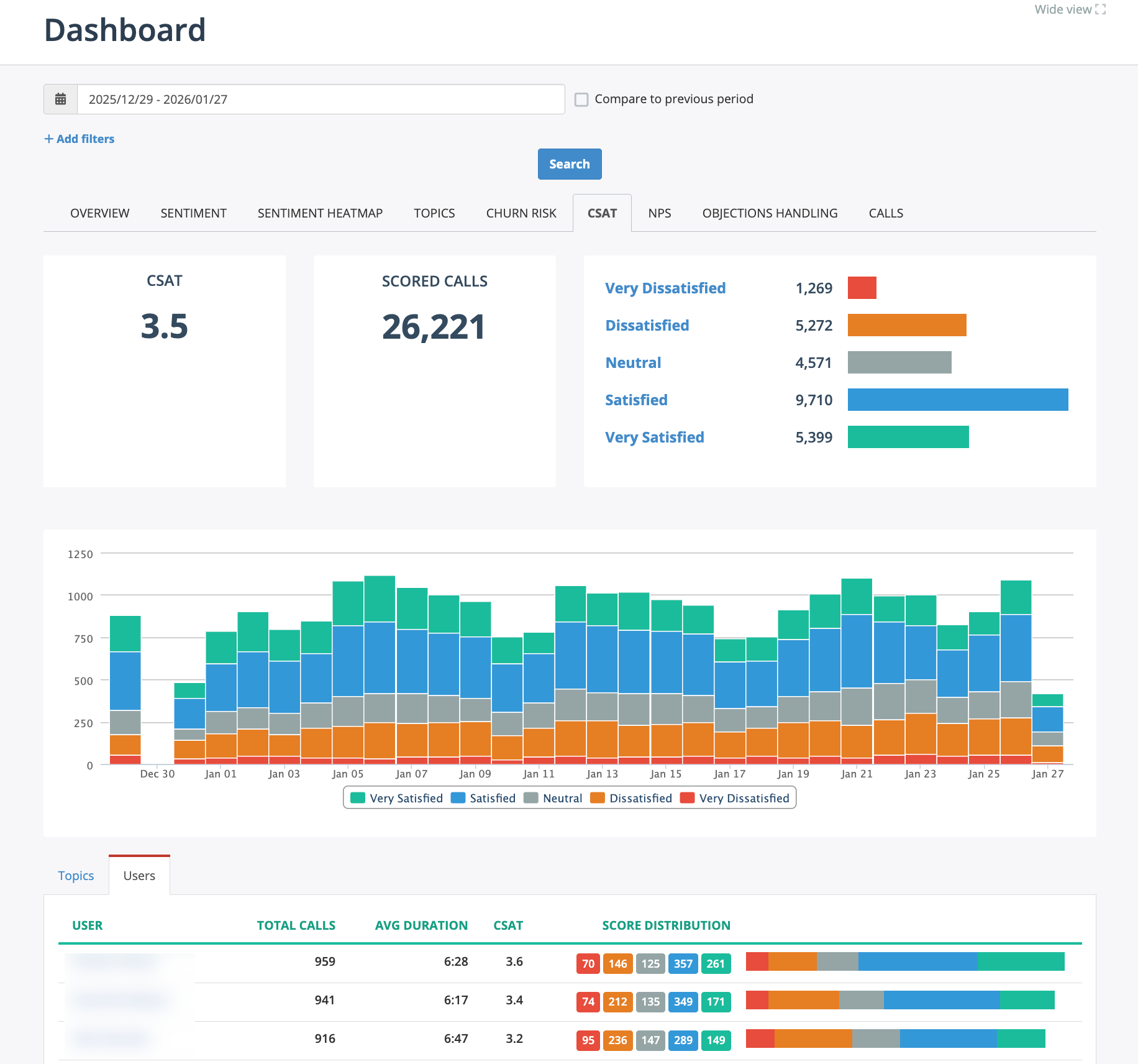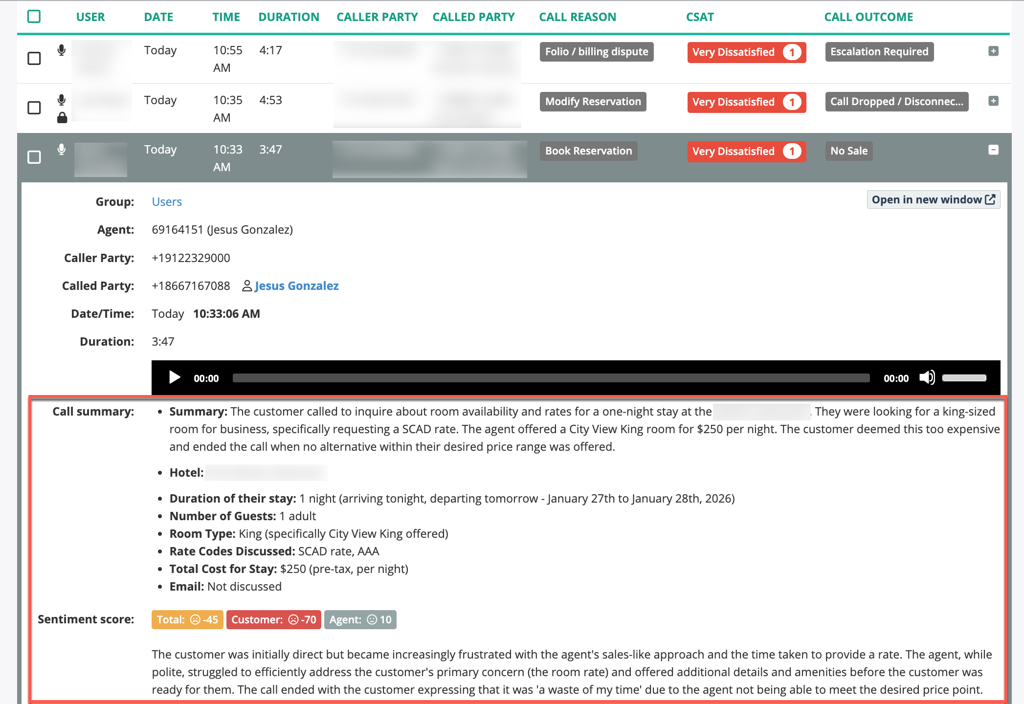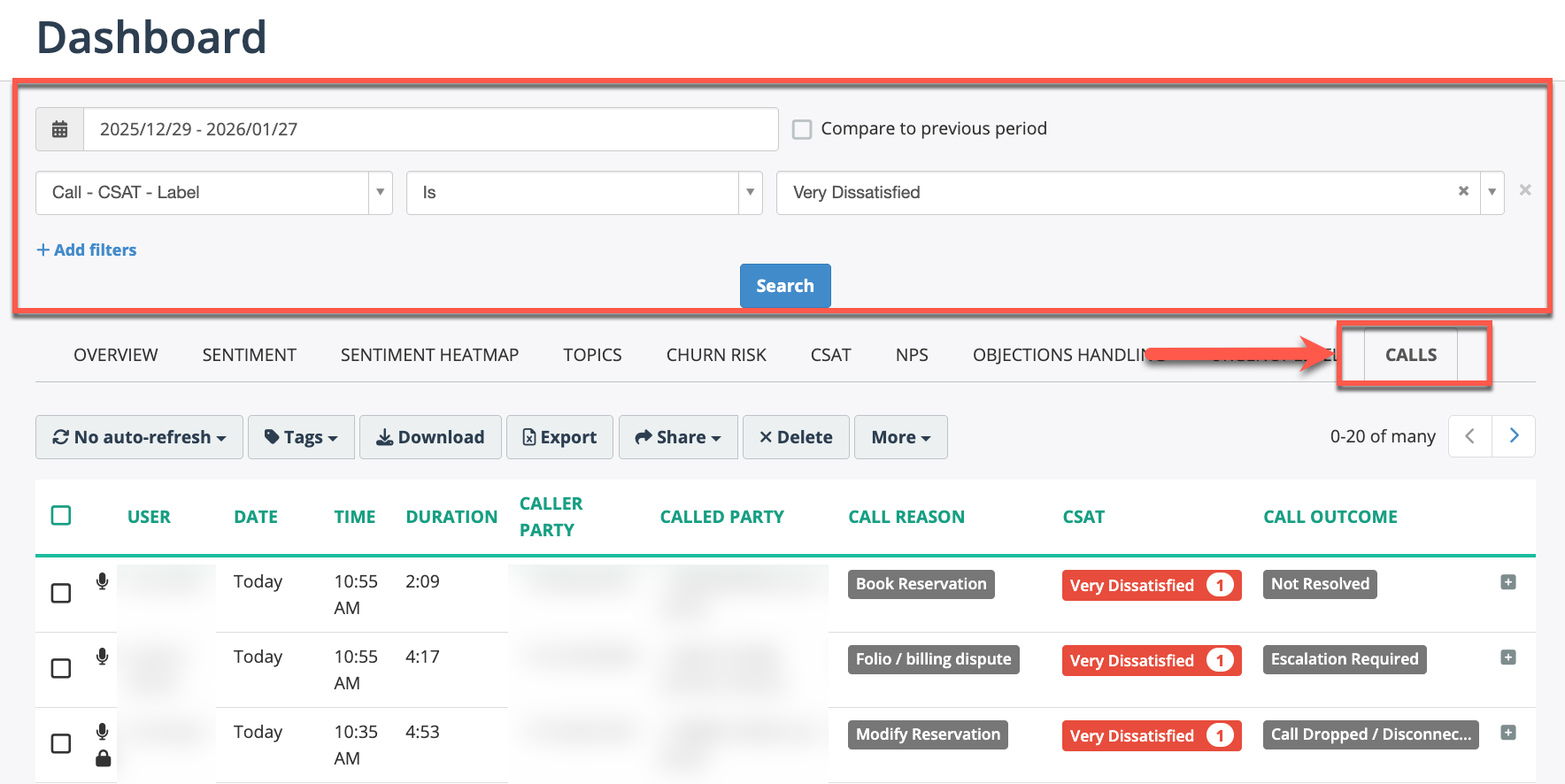 - The list shows key insights as columns (for example, Call Reason, Outcome, CSAT score).
